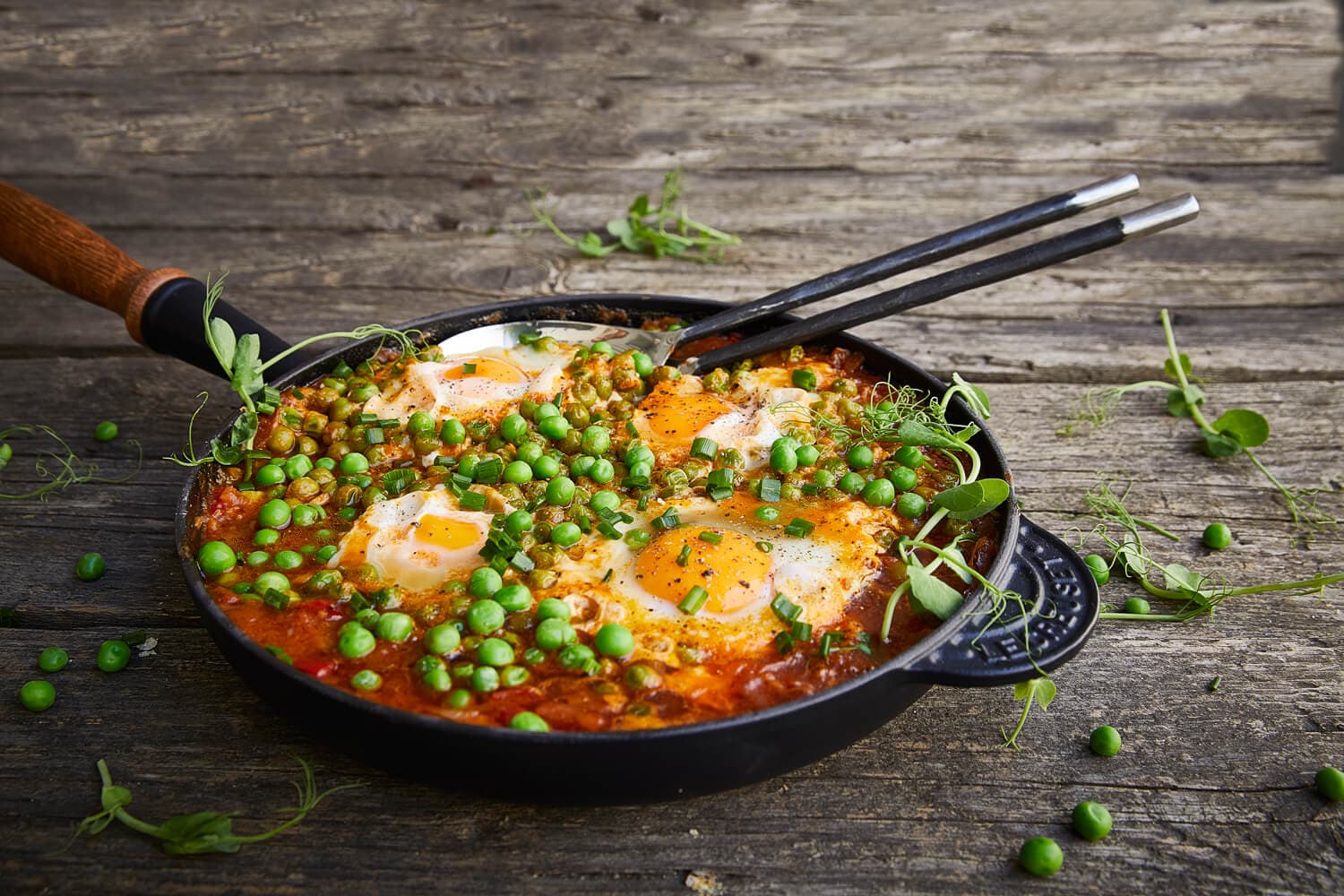 stá aí uma ótima combinação: ervilhas e ovos. Esta receita típica de Portugal oferece muito sabor, é prática de se fazer e excelente para os dias mais frios. As ervilhas são geralmente encontradas no mercado em conservas ou congeladas. Estas últimas geralmente se mantêm mais verdes e crocantes e conservam as vitaminas. O chouriço dá um toque especial. São inúmeras as versões que encontramos de Ervilha com ovos escalfados. Geralmente não resistimos a nenhuma. Aprenda a preparar esta que trouxemos para você.